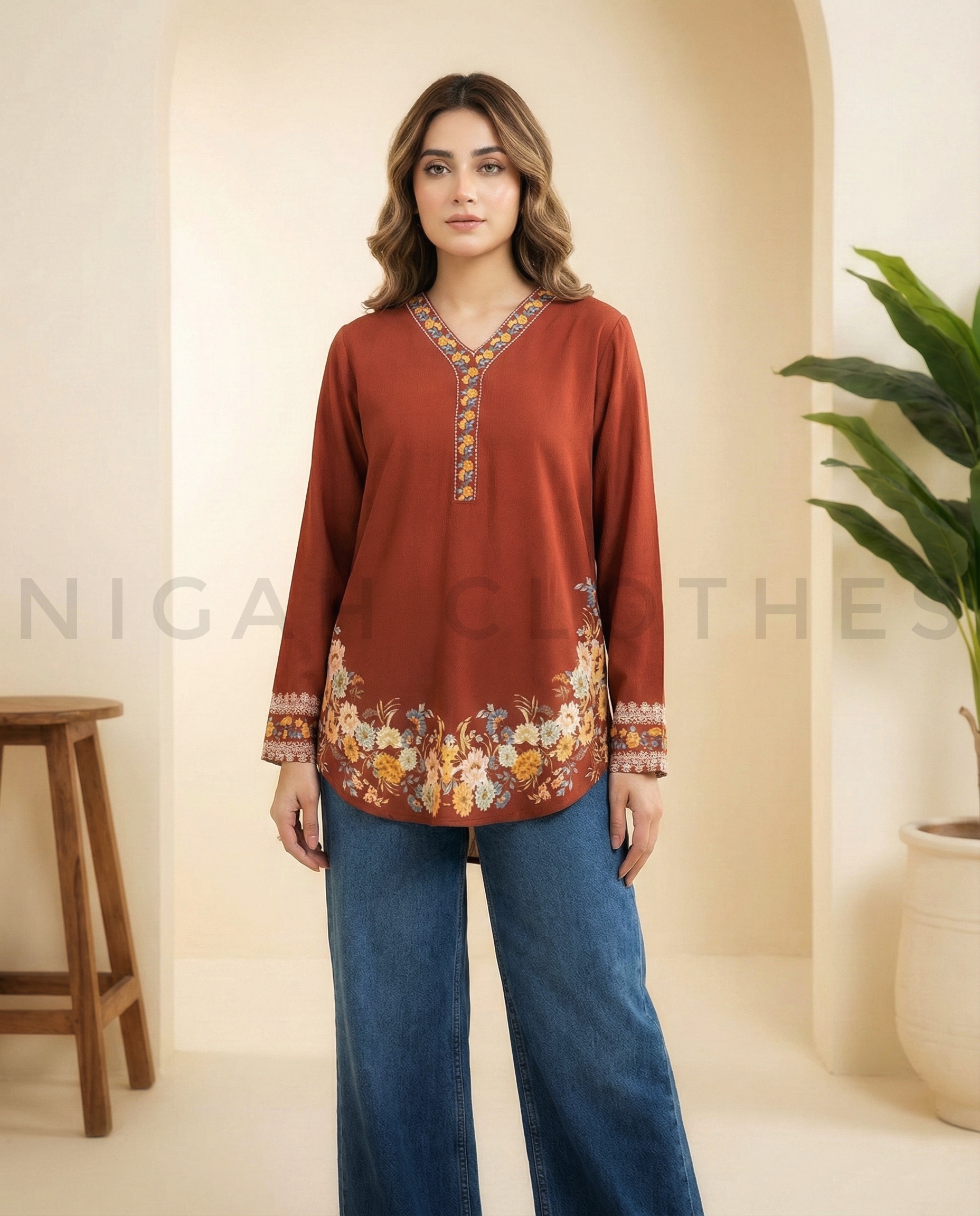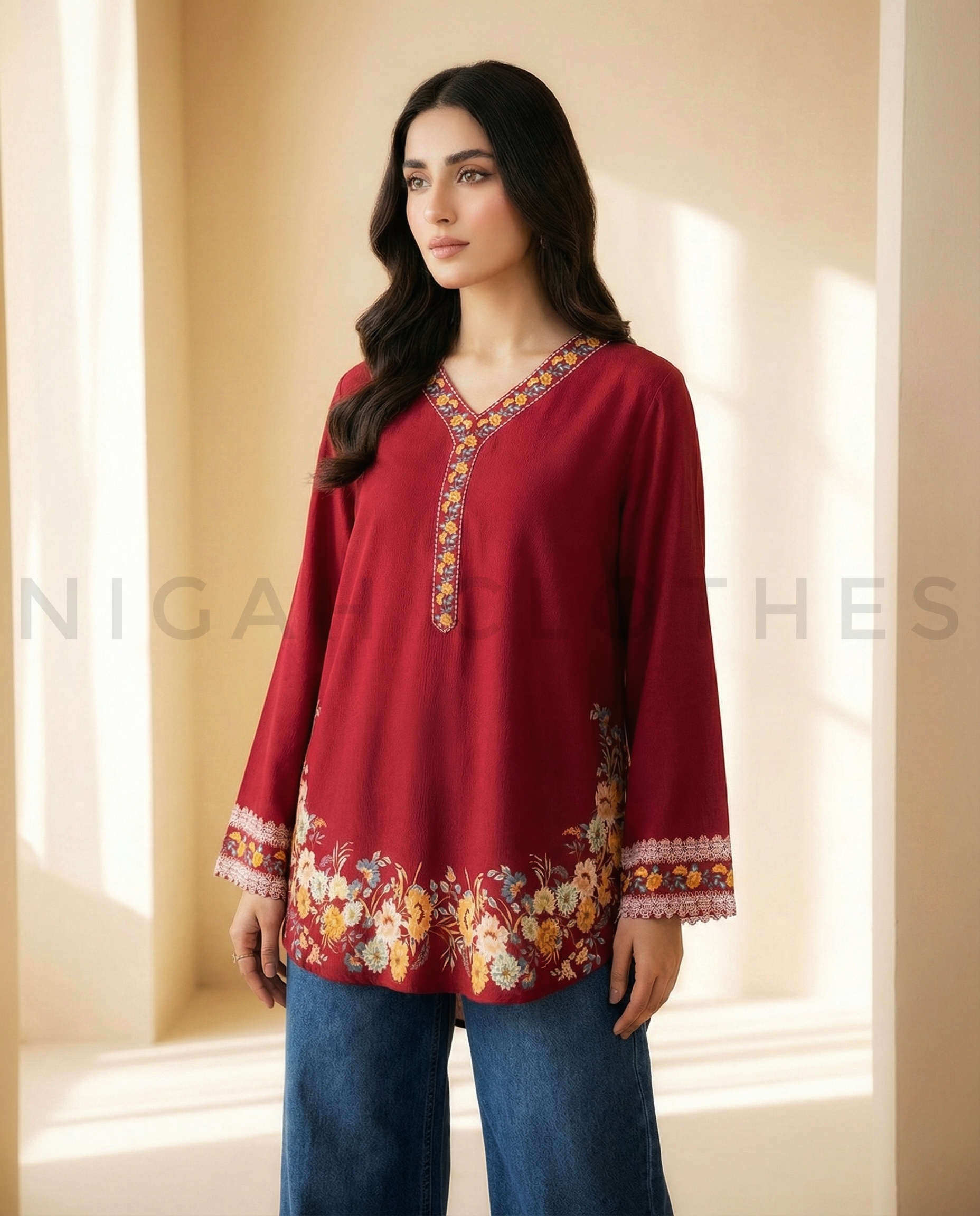 Add a touch of elegance to your everyday wardrobe with this rich crimson short kurti. Featuring a beautifully embroidered V-neckline and delicate floral detailing along the hem and sleeves, this piece blends tradition with modern charm. Designed with a relaxed silhouette and full-length sleeves, it pairs effortlessly with jeans or trousers for a graceful yet comfortable look.